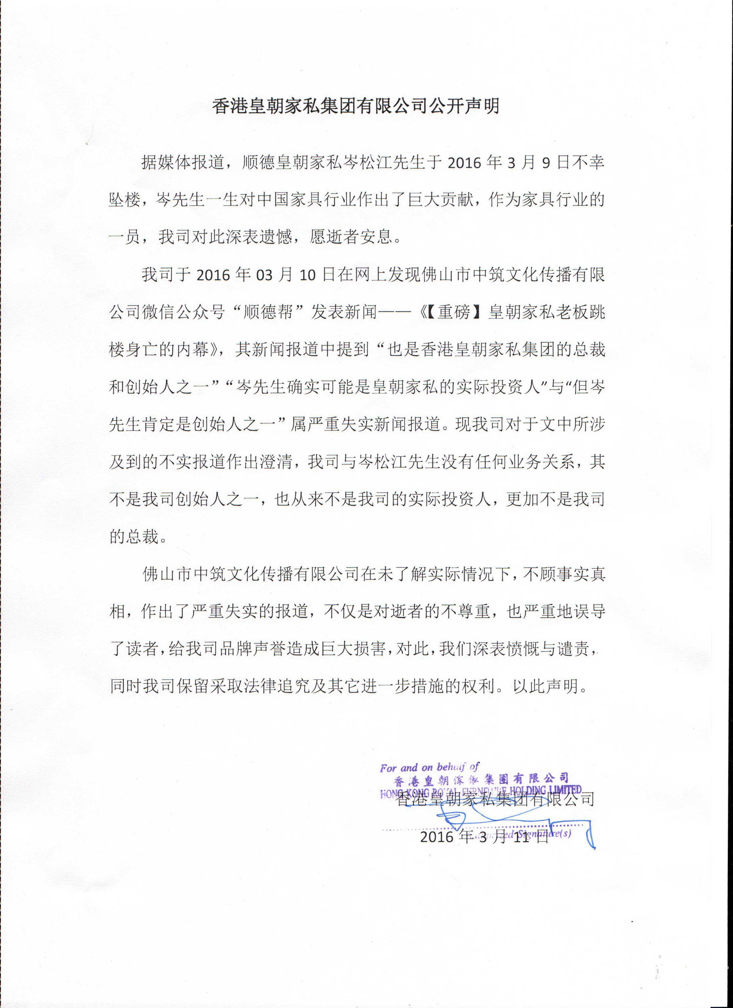 我司于2016年03月10日在网上发现佛山市中筑文化传播有限公司微信公众号“顺德帮”发表新闻——《【重磅】皇朝家私老板跳楼身亡的内幕》,其新闻报道中提到“也是香港皇朝家私集团的总裁和创始人之一”“岑先生确实可能是皇朝家私的实际投资人”与“但岑先生肯定是创始人之一”属严重失实新闻报道。现我司对于文中所涉及到的不实报道作出澄清,我司与岑松江先生没有任何业务关系,其不是我司创始人之一,也从来不是我司的实际投资人,更加不是我司的总裁。