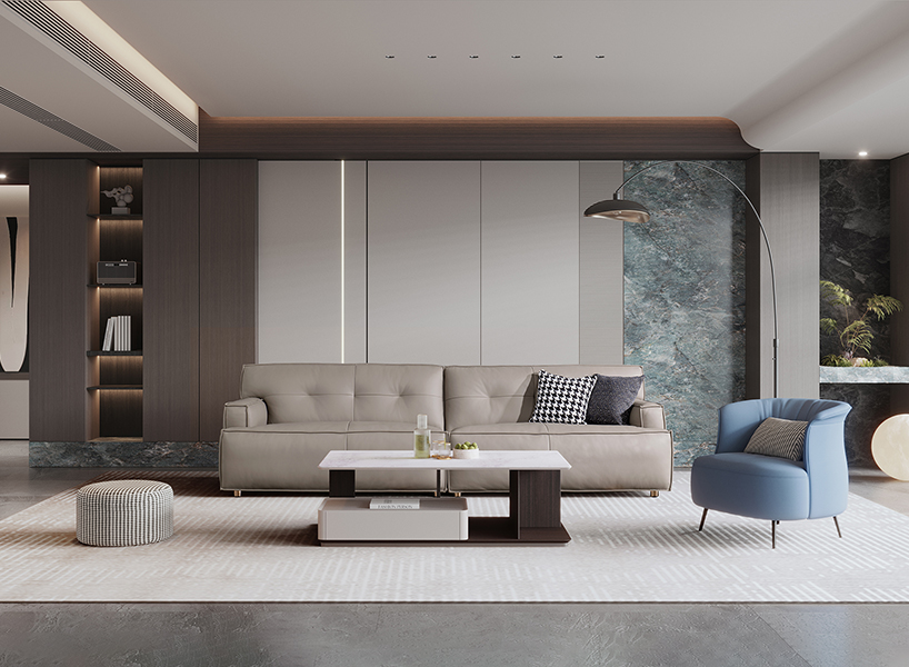 2.将皮/布艺、岩板、玻璃、金属巧妙搭配,尽享家居时尚工艺品质