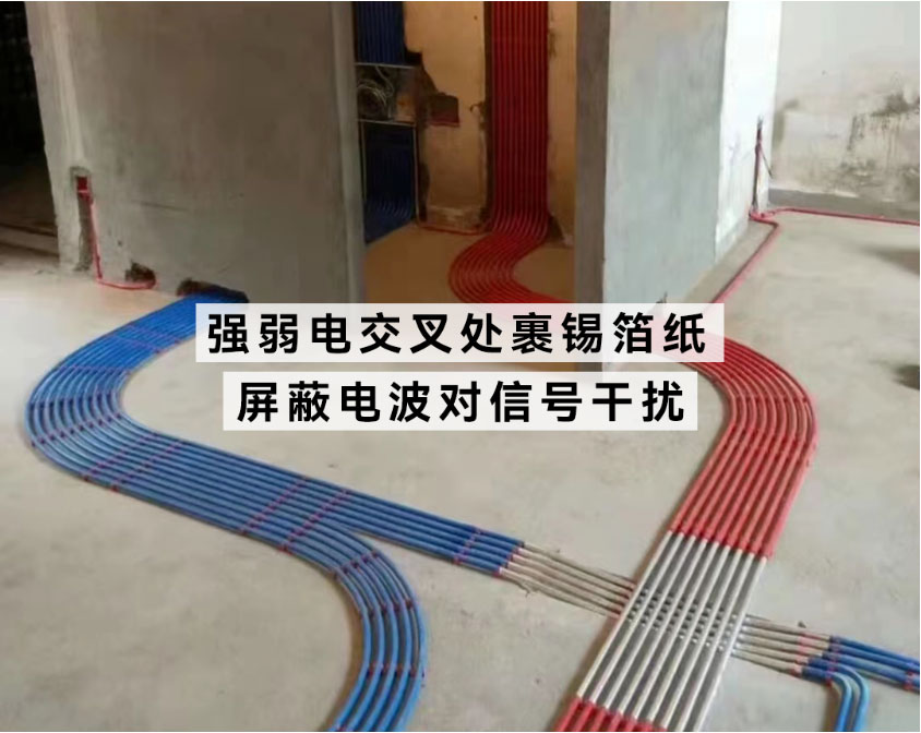 02、师傅对管线的分布按照横平竖直布线,这样子条理清楚,也方便日后的维护。强弱电区分铺设,强电就是我们常说的“电线”,弱电则是网线、电视线等。而强弱电交叉处我们会裹锡箔纸,并用铁管卡进行固定,并做到接地效果,这时吸收电磁后的锡纸就会将电流导出,起到电磁屏蔽作用,屏蔽电波对信号干扰。当然有人会说,我家的信号挺好的,没有干扰。但我们不能抱有侥幸心理,对于隐蔽工程我们需要确保防止出现问题。