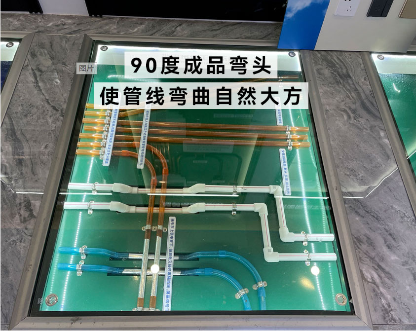 03、装修过程中难免会有弯角、弯曲的时候,虽然管线具有一定的柔韧性以及弯曲幅度,但人工弯曲过程中难免会有小意外导致材料破损,而我们皇朝家居则使用90度成品弯头,能使管线弯曲自然大方,并能加快现场施工进度。