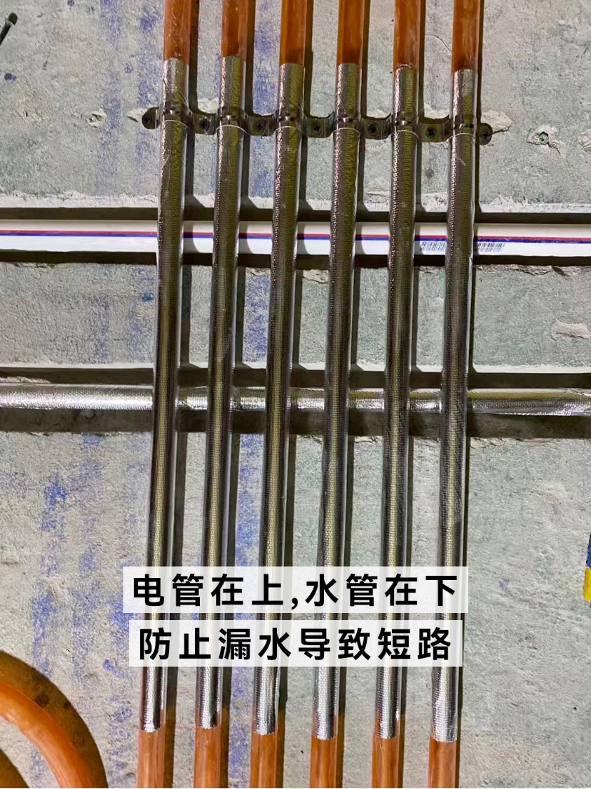 04、为了铺设水电更加安全,师傅也会遵循电管在上,水管在下的原则,防止漏水导致短路。万一水管漏水了,水也不会触及到电管,不会对人身安全造成威胁。电管在上面可以避免接触到水,从而减少漏电的风险。