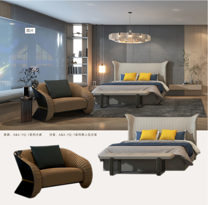 衣帽间隔断出睡眠区,大飘窗的设计,配备皮质坐垫和置物架,可以让你平时在飘窗台上休闲读书、品酒、享受阳光下的惬意时光,给你带来格调优雅的生活体验。睡眠区配备A&A品牌的大床,榉木框架,经典意大利设计,每晚都让你感受被深情拥抱的感觉,保护每一个浪漫美梦,同时搭配黑色地毯,增加安全感。床尾配置A&A品牌的单人沙发,让你在睡眠前享受单人时光。