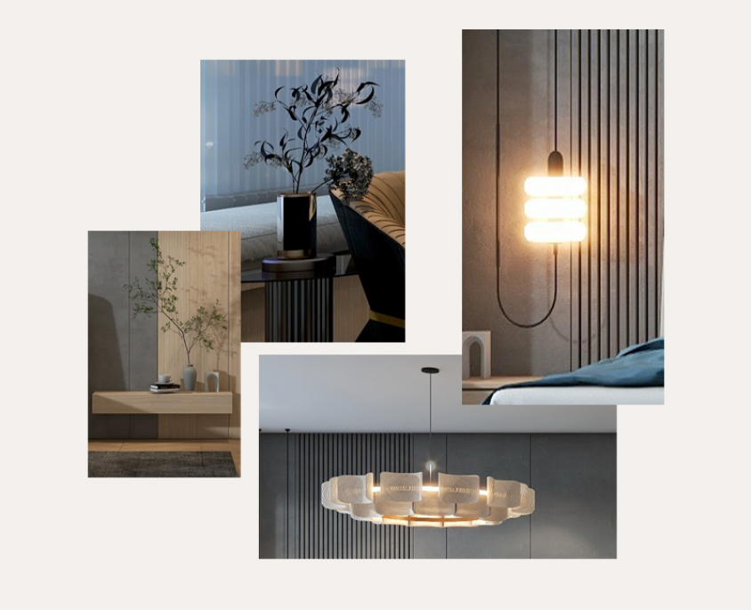 床边的悬挂吊灯、吊顶灯和床头墙身使用线性元素,摆放小摆件,共同点亮卧室的轻奢氛围。