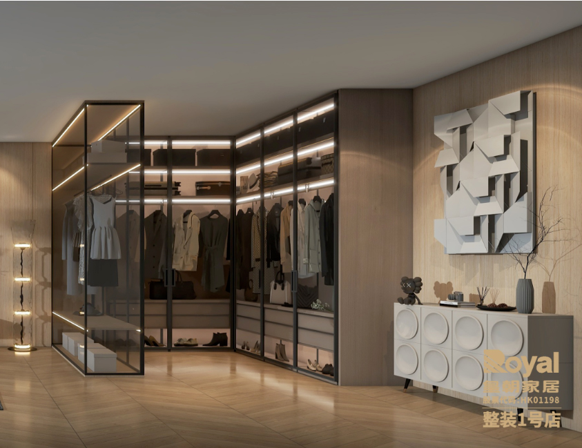 衣帽间采用半开放U型布局,黑色金属边框配玻璃柜门,增加了空间的通透性,内嵌式的暖色发光灯带更是增添了高级感和温馨感。通过木质隔板将空间分区,衣柜内部主要采用挂架形式的设计,方便存取衣物,大大减少了整理叠衣服的时间,而抽屉则用来收纳软性和贴身衣物。此外,衣帽间的顶部还预留了一定的置物空间位置。